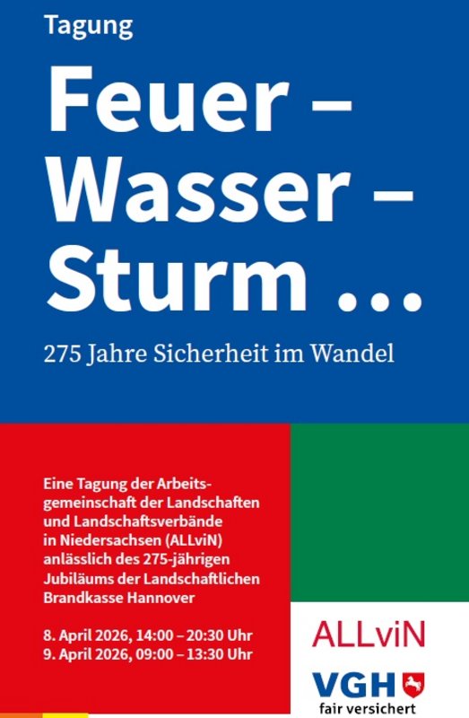 Worin lagen einst und liegen noch heute die Ziele, die Praxis und die Herausforderungen von Versicherungen? Wer gut versichert ist, schläft besser? Derzeit verändern – angesichts von Wetterkatastrophen durch Wasser und Sturm, aber auch durch zunehmende Trockenheit und Brandgefahr – Versicherungsfälle ihr Gesicht. Was bedeutet vor diesem Hintergrund überhaupt noch der Begriff „Sicherheit“. Kann sie garantiert werden? Welche gesellschaftlichen Lebensbereiche und Fragen berührt das Sicherheits- und Versicherungswesen also aktuell? All diesen Fragen, sowohl aus historischer als auch ‚brandaktueller‘ Sicht, widmet sich eine von der Arbeitsgemeinschaft der Landschaften und Landschaftsverbände in Niedersachsen veranstaltete Tagung vom 08.-09.04.2026. Ort der Veranstaltung sind die VGH Versicherungen, Warmbüchenkamp 8, 30159 Hannover.